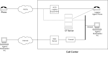 連接到傳統(tǒng)的ACD上. 主叫方的信息例如IP地址, Email地址等被傳送的哦CTI服務(wù)期. CTI服務(wù)期可以用這些信息去客戶數(shù)據(jù)庫(kù)中進(jìn)行查詢, 影響到座席代表的路由,