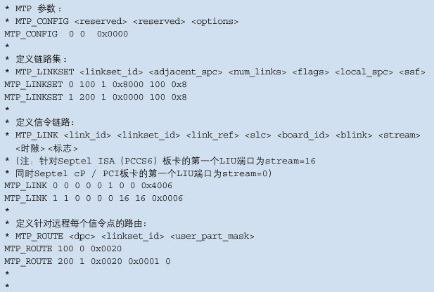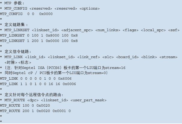 每一目標路由(包括相鄰節(jié)點)都應(yīng)該指明兩個鏈路集。主要的是連接本地MTP到相鄰節(jié)點的鏈路集的標識符。參數(shù)應(yīng)該用來表示連接共享一個本地點代碼的兩個MTP3層的鏈路集。參數(shù)應(yīng)該設(shè)為0x0001,表明第二個鏈路集已經(jīng)被指定,并且只有在通過主要鏈路集無法路由到目標節(jié)點的情況下,才可使用這個鏈路集來路由傳輸流量。所有其它參數(shù)的含義都與用戶手冊中描述的單MTP設(shè)置中的參數(shù)相同。