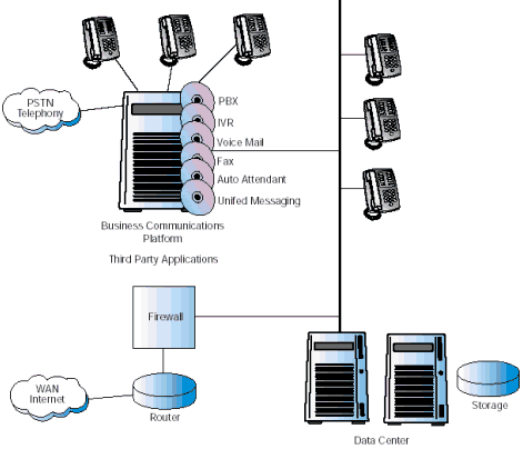 一個(gè)簡(jiǎn)單的更有效的方法去配置和管理企業(yè)的通信系統(tǒng)是用一個(gè)基于商務(wù)通信平臺(tái)概念的融合系統(tǒng),來(lái)取代已經(jīng)過(guò)時(shí)了的PBX/KTS和它的附屬媒體服務(wù)器。這樣一個(gè)系統(tǒng)的基本結(jié)構(gòu)如圖2所示。 商務(wù)通信平臺(tái)處于企業(yè)通信系統(tǒng)的心臟位置,是一個(gè)開(kāi)放的、基于標(biāo)準(zhǔn)的、為傳統(tǒng)的和下一代語(yǔ)音應(yīng)用和服務(wù)建立的平臺(tái)。系統(tǒng)建立在標(biāo)準(zhǔn)計(jì)算機(jī)和計(jì)算機(jī)電話構(gòu)建模塊上,包括網(wǎng)絡(luò)和局站的接口,以及豐富的通信媒體資源。在傳統(tǒng)結(jié)構(gòu)下運(yùn)行于單個(gè)附屬服務(wù)器上的應(yīng)用,現(xiàn)在運(yùn)行于一個(gè)邏輯結(jié)構(gòu)之上,在該結(jié)構(gòu)中,單個(gè)或多個(gè)物理服務(wù)器連接到企業(yè)網(wǎng)絡(luò)上。 商務(wù)通信平臺(tái)還具有一個(gè)優(yōu)勢(shì),就是作為電路交換時(shí)分復(fù)用(TDM,time