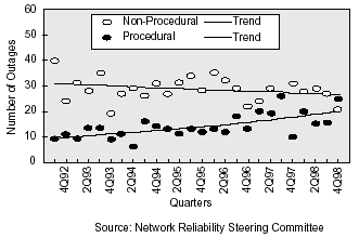 根據(jù)來自網(wǎng)絡(luò)可靠性指導委員會(NRSC)的研究,對于33%報告的業(yè)務中斷,程序出錯是根本原因。程序中斷的頻率有上升的趨勢,正如在右面圖中顯示的那樣。