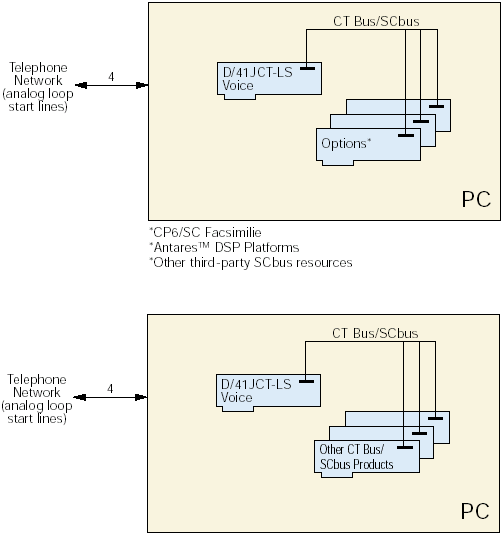 使用D/41JCT-LS板卡和CT總線時,來自網(wǎng)絡板卡或其他資源的數(shù)字語音和資源通過H.100接頭和CT總線接口進入板卡。由一個CT612芯片管理這些信號,并且作為通道協(xié)調器和矩陣交換機來緩存來自總線的高速信號數(shù)據(jù),直到每個通道的數(shù)據(jù)發(fā)送到DSP。