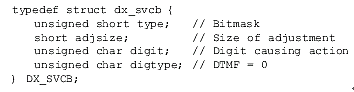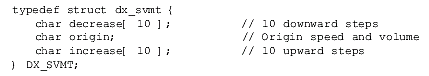 速度/音量調(diào)節(jié)表(DX_SVMT)數(shù)據(jù)結(jié)構(gòu)有21個代表不同級別的速度和音量的條目,用于指定信道的速度或者音量調(diào)節(jié)的變化率。這些值可以設(shè)置或者用dx_setsvmt()和dx_getsvmt()從表中取值。