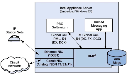 PBX 應(yīng)用可以被實(shí)施在一個低成本的Dialogic應(yīng)用設(shè)備或一個使用Dialogic處理器的普通臺式計算機(jī)上. 最終用戶可以根據(jù)需要選擇平臺.